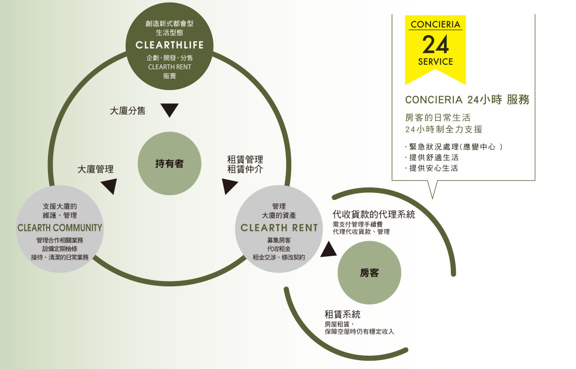 CLEARTHLIFE集團中的CONCIERIA,從住家的選擇到大廈的投資,利用各種管道貼近顧客。除了熟知的大廈企劃、開發、分售之外,租賃管理與租賃仲介,甚至擴大到大廈管理事業,發展不動產相關的各種解決方案事業,全力支援大廈的經營。